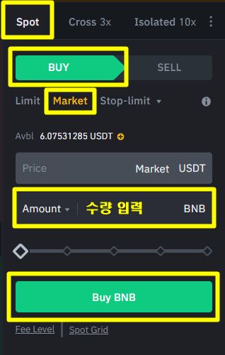현물(Spot) 마켓에서 BNB를 스냅샷을 찍을 개수만큼 매수합니다. Spot → Buy 탭 → Market(시장가) → Amount(수량) 입력 후 Buy BNB를 클릭하시면 됩니다. 만 달러 이상 매매를 하시는 분들은 슬리피지 손실을 최소화하기 위해 한번에 구매하지 마시고 5천 달러씩 끊어서 매수하시기 바랍니다.