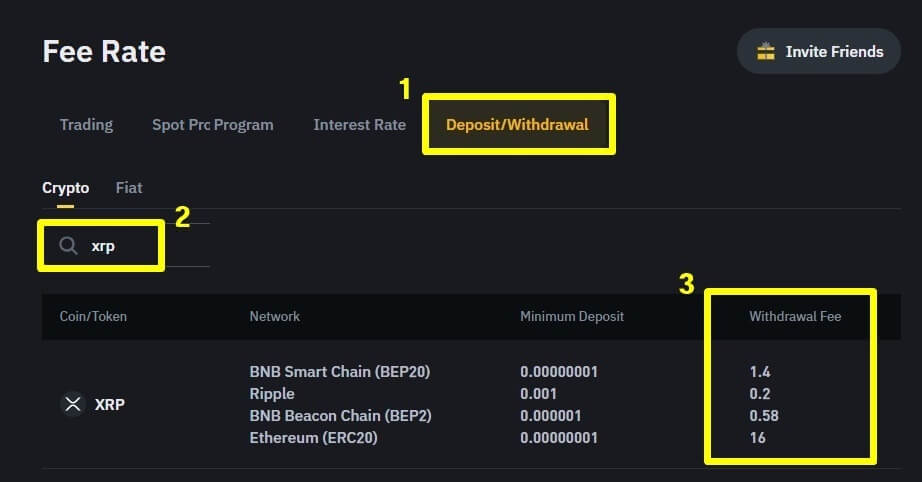 리플을 확인해 보면 4개의 네트워크(BEP20, Ripple, BEP2, ERC20)가 있고 각각의 네트워크마다 최소 입금량(Minimum Deposit), 최소 출금 수량(Minimum withdrawal), 입금 수수료(Deposit Fee), 출금 수수료 (Withdrawal Fee)를 확인할 수 있습니다.
