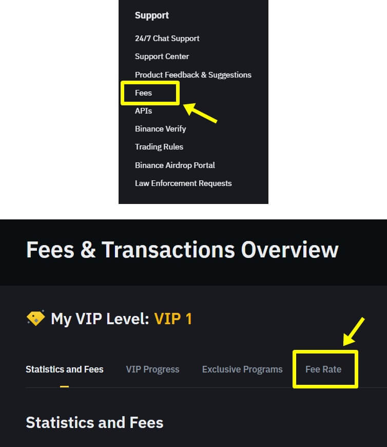 바이낸스 사이트에서 스크롤을 내리기 → Support 메뉴에서 Fees(수수료) 클릭 → Fee Rate 클릭