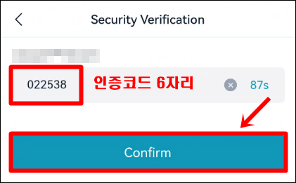 그다음 'send' 버튼을 눌러 이메일(또는 SNS)로 날아오는 6자리 인증코드를 넣고 'Confirm' 버튼을 눌러줍니다.