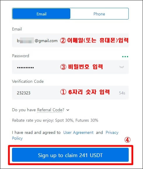 입력한 이메일(또는 휴대폰 번호)로 날아오는 인증번호 6자리 숫자를 넣고 'Sign up'(등록하기) 버튼을 눌러줍니다.
