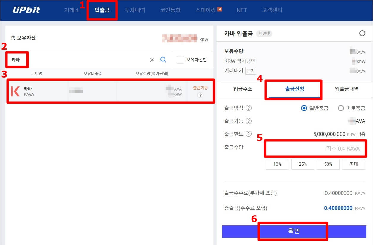 업비트 메뉴에서 '입출금' → 카바 검색 → 카바 행 클릭 → '출금신청' 탭 → 출금수량 입력 후 '확인' 버튼을 클릭합니다.