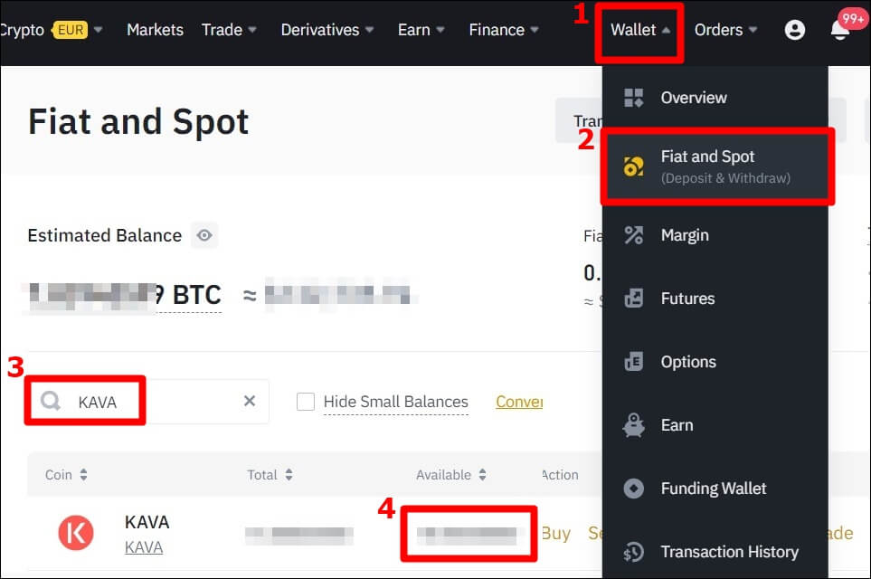 바이낸스 사이트 우측 위의 메뉴로 가서 Wallet → Fiat and Spot → KAVA 검색하여 입금된 수량이 내가 보낸 수량과 같은지 확인하시면 됩니다. (수수료로 0.4개 떼 갑니다)