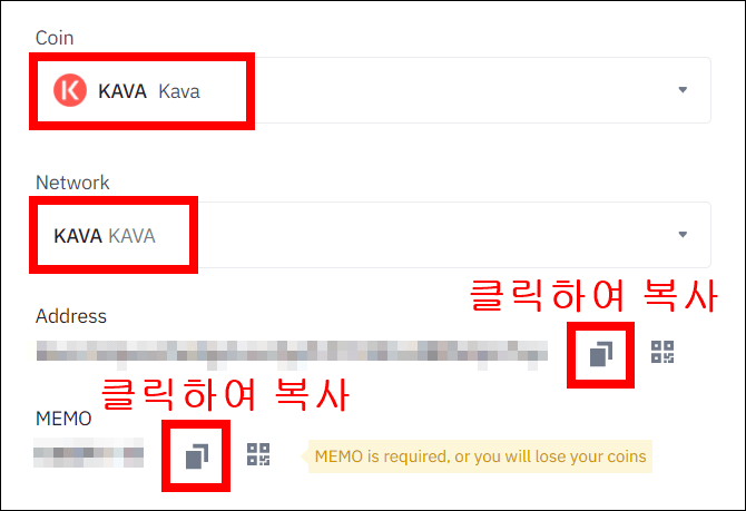 Coin 이름을 'KAVA'로 하고 Network도 'KAVA'로 선택한 후에 지갑 주소(Address)와 MEMO를 각각 복사해둡니다. 이제 업비트로 가보겠습니다.