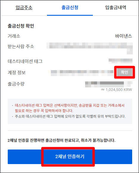 '확인' 버튼을 눌러 출금신청 확인을 한 후에 '2채널 인증하기'를 눌러 카카오페이 또는 네이버 인증을 해주면 출금이 진행됩니다.