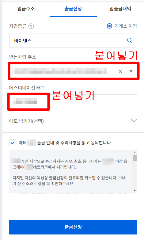 지갑 종류는 '바이낸스'를 선택하고 주소와 태그를 각각 붙여넣기 후 '출금신청'을 합니다.