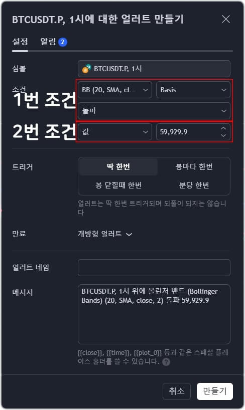 1번 조건은 가격, 돌파로 설정하고, 2번 조건은 BB(볼린저 밴드)의 Upper(상단)으로 설정하면, 얼러트가 작동하는 조건은 BTC 가격이 볼린저 밴드의 상단을 돌파하면 얼러트가 작동하게 됩니다.